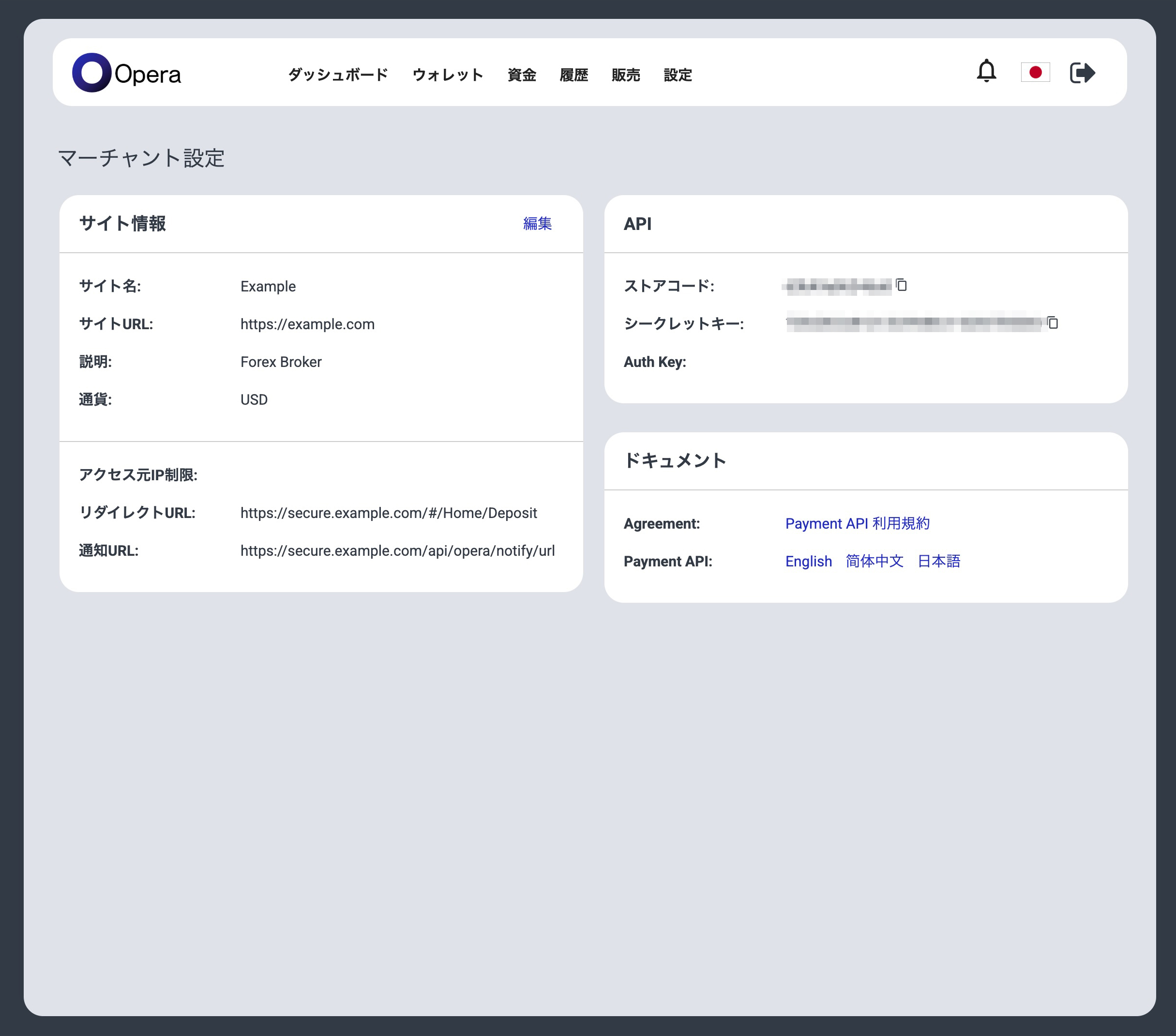 マーチャントアカウントを開設後、Operaウォレット決済を導入する手順について、ウォレットの設定メニュー>マーチャント設定画面で行います。