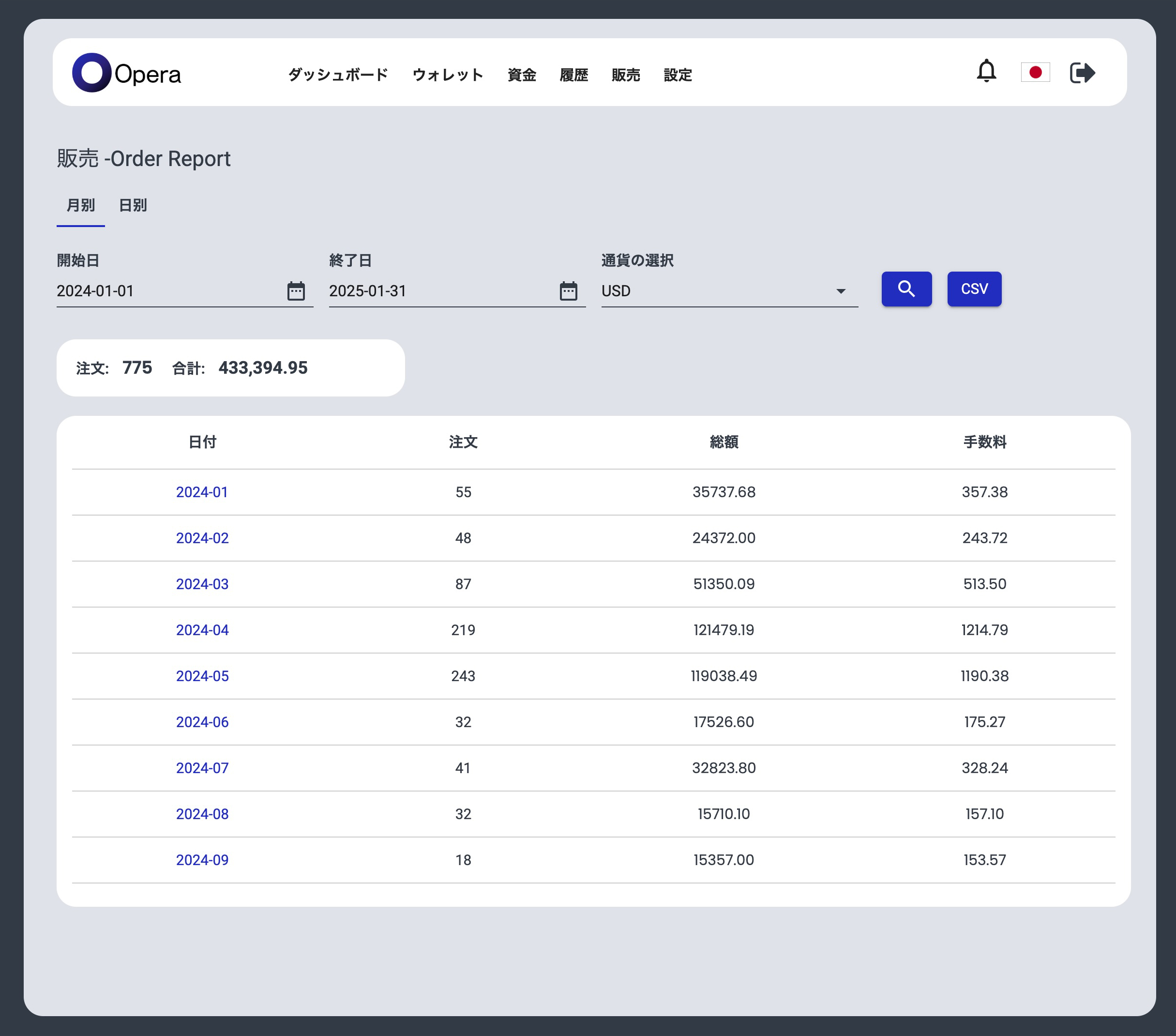 オーダー情報は、マーチャントウォレットの販売メニューで確認することができます。売上の出金は、ウォレット出金のプロセスでいつでも出金申請をすることができます。